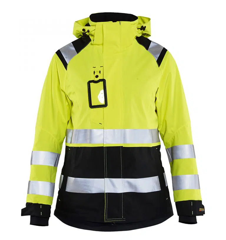 Wind- and waterproof shell jacket tailored for women. The Safety jacket has a mesh lining and a hard-wearing, wind- and waterproof material with taped seams, as well as dark colour patches where the garment is most exposed to grime. The jacket has a fleece-lined collar and a detachable adjustable hood. For increased freedom of movement, the jacket has a two-way zipper, pre-bent arms and a long back. 50 mm wide reflective transfers for increased visibility and several practical zipped pockets. The Safety jacket can be worn all year round and with an extra fleece layer in colder weather.